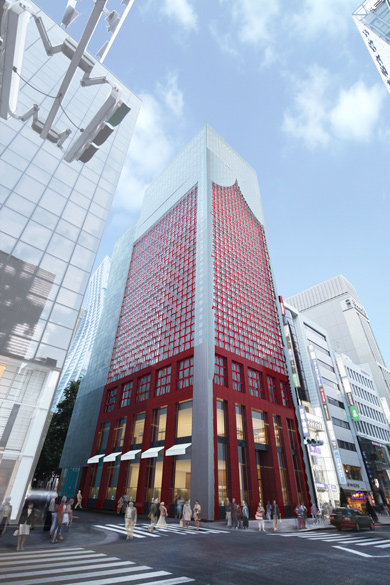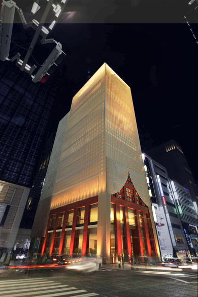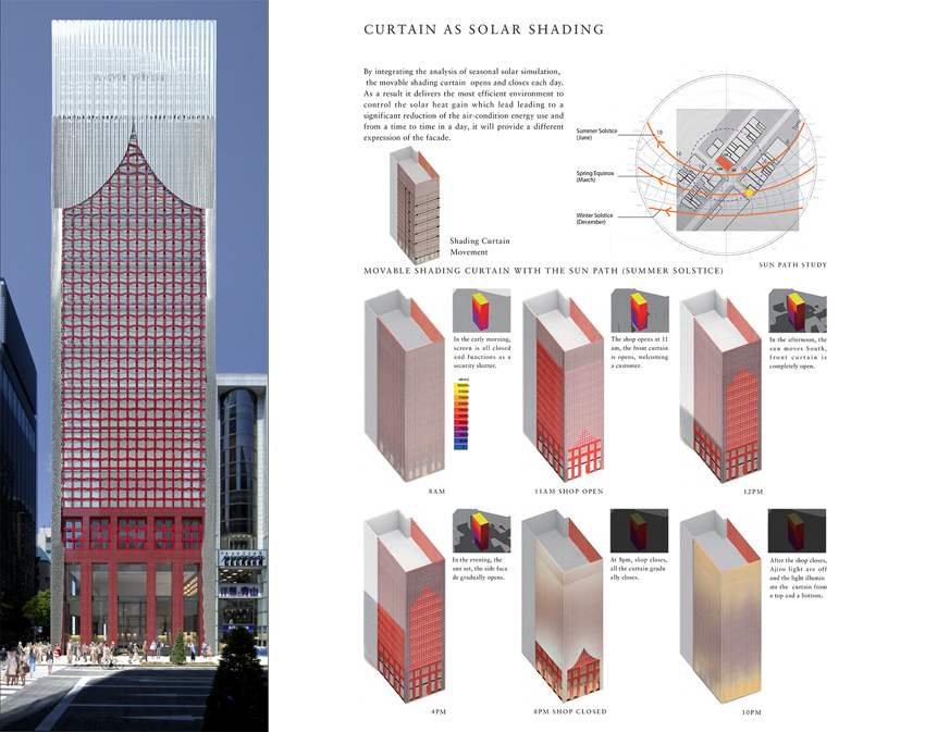 The façade of Ginza Temple is the expression of innovative environmental technologies and the traditions of the brand. The lower level shop maintains the classical order of red stone like the boutique in London. The façade of office floors above the boutique is designed as continuation of the red stone wall composed of window frames of ajiro pattern, the traditional Japanese wickerwork. These two glass façades are veiled in movable shading curtains made by knitted stain-less steel rings.