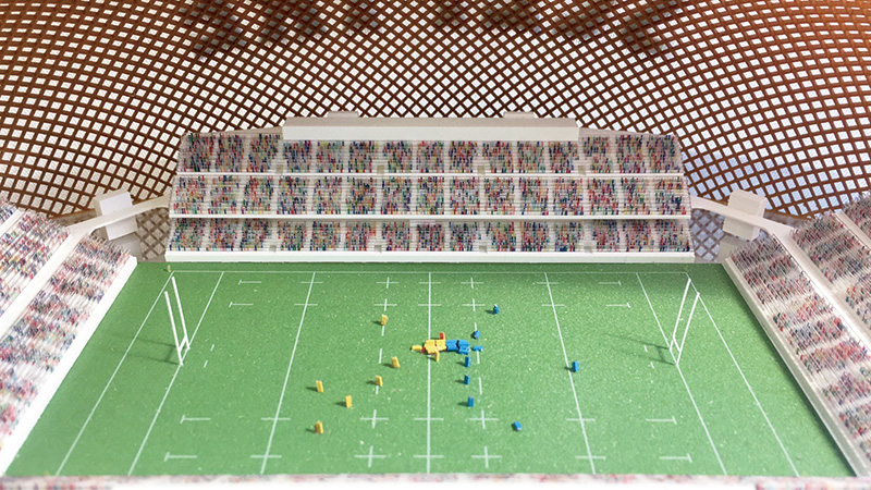 建築家らしい提案をしたいと思い、ラグビーボールの形をした屋内競技場の設計をした。世界中見渡しても屋根付きのラグビー競技場はなく、雨でも試合をする。選手は泥だらけになるし、ぬかるんだ状態は芝にもよくない。そこで幾何学的にはボールの形と構造の合理性を一体化した木構造にした。